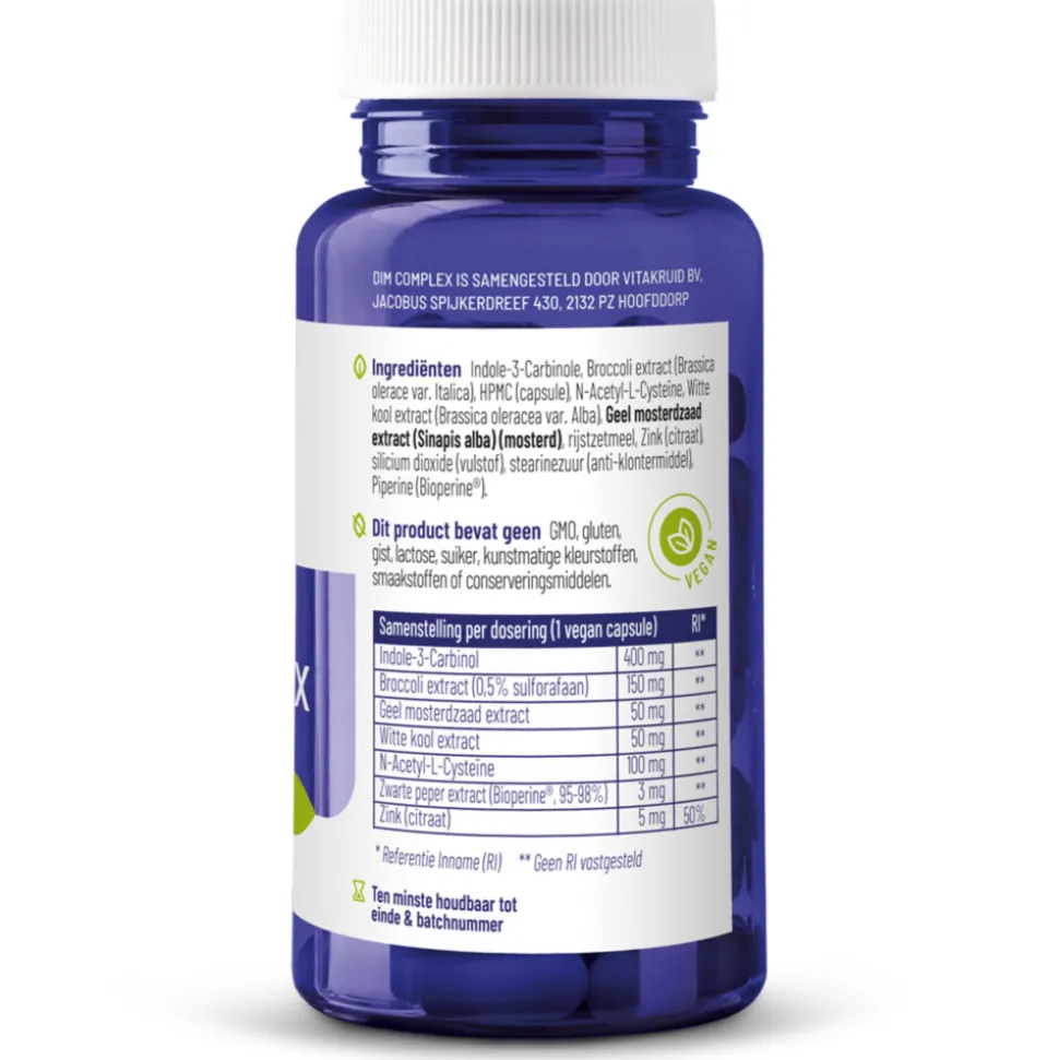 Vitakruid DIM Complex is een voedingssupplement met maar liefst 400 mg Indole-3-Carbinol (I3C) per capsule, deze stof is van nature te vinden in kruisbloemige groenten. Dit voedingssupplement draagt bij tot een normale hormoonhuishouding* en bevat de dagelijkse dosering die nodig is voor het gewenste effect. I3C is de eerste voorloperstof van Diindolylmethaan, dit wordt ook wel DIM genoemd. Dit omzettingsproces gebeurt met behulp van de stof sulforafaan, deze stof is ook rijkelijk aanwezig in het DIM-Complex. Daarnaast is het voedingssupplement ook geschikt voor vegetariërs en veganisten