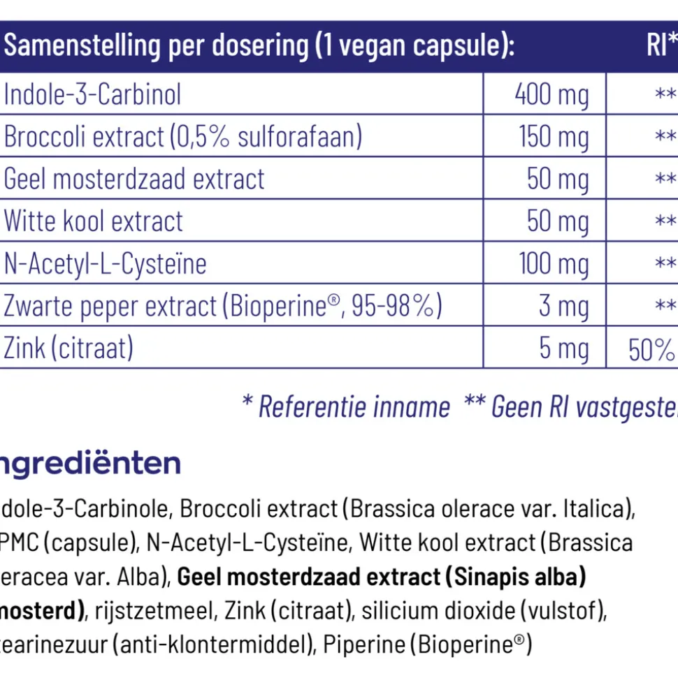 Indole-3-Carbinole, Broccoli extract (Brassica olerace var. Italica), HPMC (capsule), N-Acetyl-L-Cysteïne, Witte kool extract (Brassica oleracea var. Alba), Geel mosterdzaad extract (Sinapis alba), rijstzetmeel, Zink (citraat), bamboe extract, stearinezuur (anti-klontermiddel), Piperine (Bioperine®).