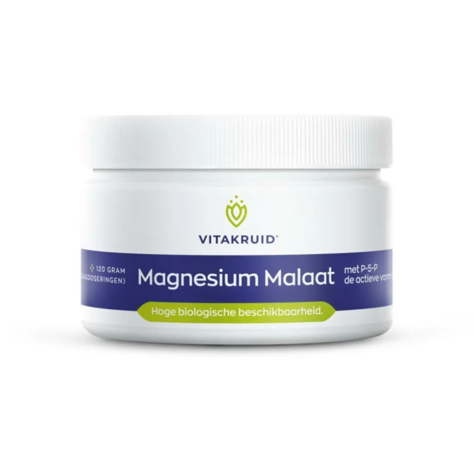 Vitakruid Magnesium Malaat is een supplement met organisch (natuurlijk) gebonden magnesium, namelijk magnesiummalaat in combinatie met P-5-P (actieve vorm van vitamine B6). Deze vorm van magnesium wordt beter opgenomen dan anorganische (‘dode’) magnesiumvormen, zoals magnesiumsulfaat. Magnesiummalaat is een verbinding van magnesium en appelzuur. Deze vorm helpt om te ontspannen en levert de spiercellen energie. Appelzuur is een belangrijke stof in de citroenzuurcyclus. In het menselijk lichaam wordt bijna alle energie in de cellen aangemaakt tijdens de citroenzuurcyclus. Magnesiummalaat speelt in vele enzymen een belangrijke rol om in de ATP (adenosinetrifosfaat) synthese energie vrij te maken uit aërobe verbranding. ATP is de belangrijkste energievoorziener van het menselijk lichaam. Deze stof wordt gevormd in de mitochondriën van de cellen en wordt bij inspanning voor de spieren gebruikt. Magnesiummalaat zorgt erbij de ATP synthese voor dat er na inspanning geen melkzuur wordt gevormd.