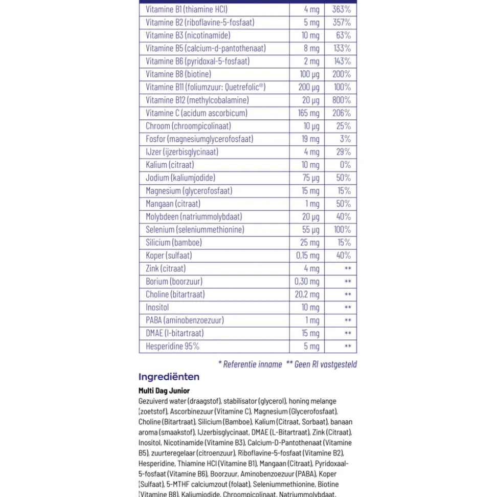 Vitakruid Multi Dag Junior is een suppletie met de juiste voedingsstoffen op de juiste momenten van de dag en kan kinderen ondersteunen in hun prestaties. Zo activeert de hoge dosering vitamine B12 in de Multi Dag Junior de natuurlijke energie in het lichaam, is de vitamine C goed voor het concentratievermogen en draagt de toegevoegde calcium bij aan de zenuwfunctie. Een innovatieve formule speciaal gericht op de dag.