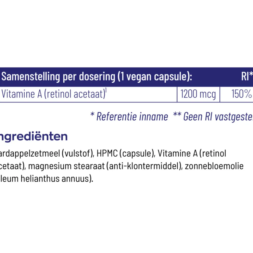 Aardappelzetmeel (vulstof), HPMC (capsule), Vitamine A (retinol acetaat), magnesium stearaat (anti-klontermiddel), zonnebloemolie (oleum helianthus annuus).