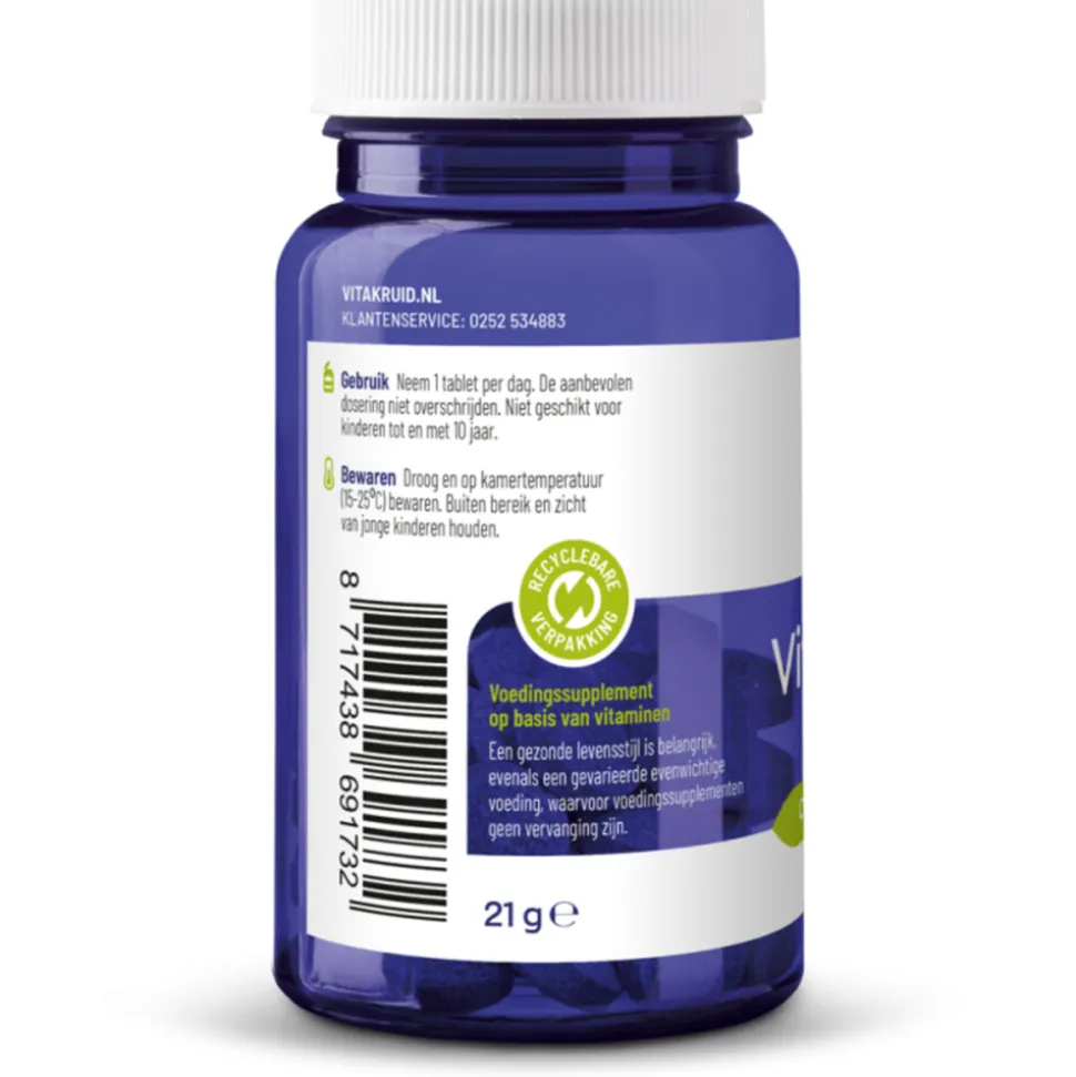 Vitakruid Vitamine D3 Vegan is gemaakt uit algen in plaats van dierlijk wolvet. Deze tabletten zijn daarom ook geschikt voor veganisten. Vitamine D bevordert een goed calciumgehalte in het bloed* en verhoogt de calciumopname in de botten*. Vitamine D heeft een positieve invloed op het immuunsysteem*. De tabletjes van Vitakruid vitamine D3-25 mg zijn klein waardoor ze makkelijk slikbaar zijn.