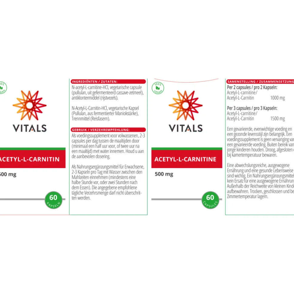 Vitals Acetyl-l-carnitine 500 mg, de geacetyleerde vorm van carnitine