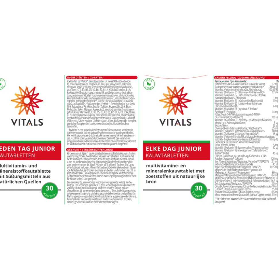 Vitals Elke Dag Junior is een kauwtablet in de vorm van een olifantje met aardbeiensmaak, speciaal ontwikkeld voor kinderen vanaf 3 jaar. Het product is samengesteld op basis van de meest recente wetenschappelijke inzichten, afgestemd op actuele gegevens aangaande de voedingsstatus in Nederland en de optimale innamehoeveelheden per nutriënt. De kauwtablet bevat bijna allemaal dezelfde hoogwaardige stoffen als Elke Dag voor volwassenen, maar dan zijn de doseringen aangepast aan de behoeften van (jonge) kinderen. Zo bevat een tabletje maar liefst 15 μg vitamine D3 (losse vitamine D-druppels zijn dus niet meer nodig). En er zit 60 mg magnesium en 120 mg calcium in, uit natuurlijke bron.