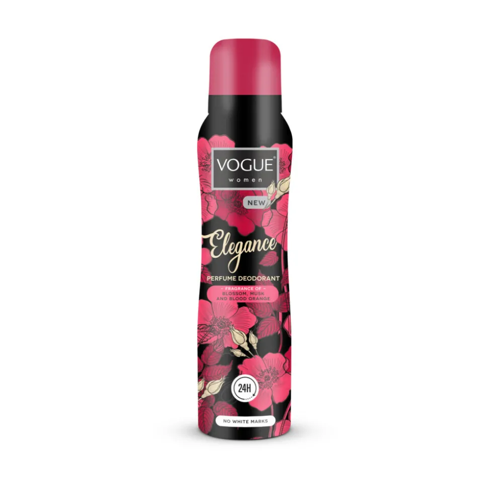 De Elegance Parfum Deodorant van Vogue is een heerlijke spray deodorant die 24 uur lang bescherming met een fantastische geur biedt. Het fijne van deze deodorant is dat deze geen witte strepen achterlaat op je kleding en je de hele dag lekker ruikt.