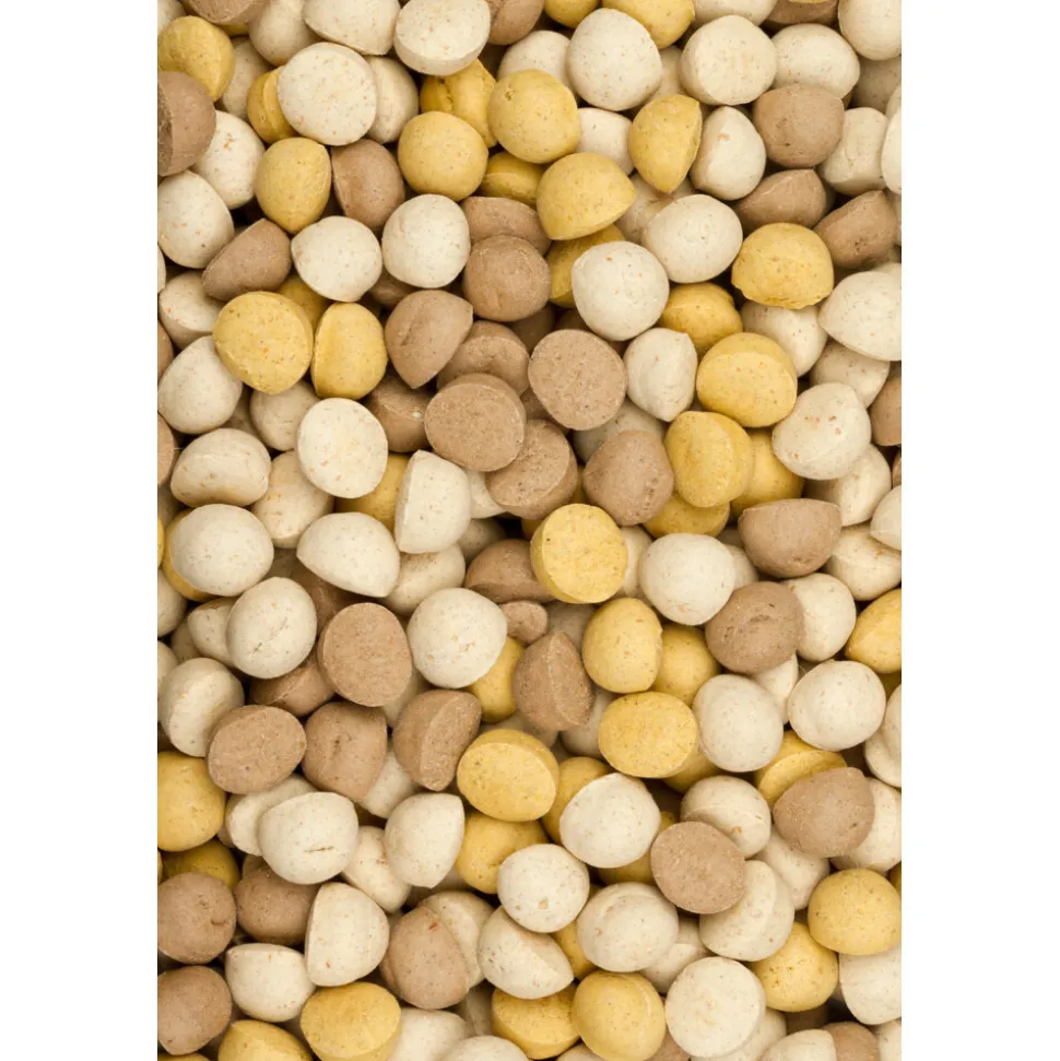 Granen, dierlijke bijproducten, plantaardige oliën en vetten, glucose en mineralen. EG toegestane kleurstoffen.