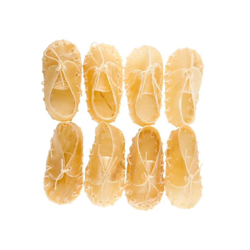 Smakelijke schoentjes! Deze leuke schoentjes zijn gemaakt van gedroogde runderhuid. Ze zien er niet alleen leuk uit maar geven jouw kleine viervoeter ook urenlang kauwplezier.