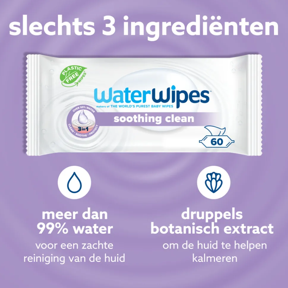 WaterWipes Billendoekjes Soothing zijn ontwikkeld voor de meest gevoelige huid. Ze bestaan uit meer dan 99% gezuiverd water en biologische botanische extracten. Dankzij de kalmerende en beschermende werking zijn deze doekjes ideaal vanaf de geboorte. Jij kiest bewust voor een veilige en natuurlijke verzorging – zonder plastic, parfum of agressieve ingrediënten. WaterWipes reinigen zacht en zijn geschikt voor dagelijks gebruik, zowel thuis als onderweg. Zelfs bij eczeem of allergieën bieden ze comfort en vertrouwen*. Aanbevolen door kraamverzorgenden in Nederland.