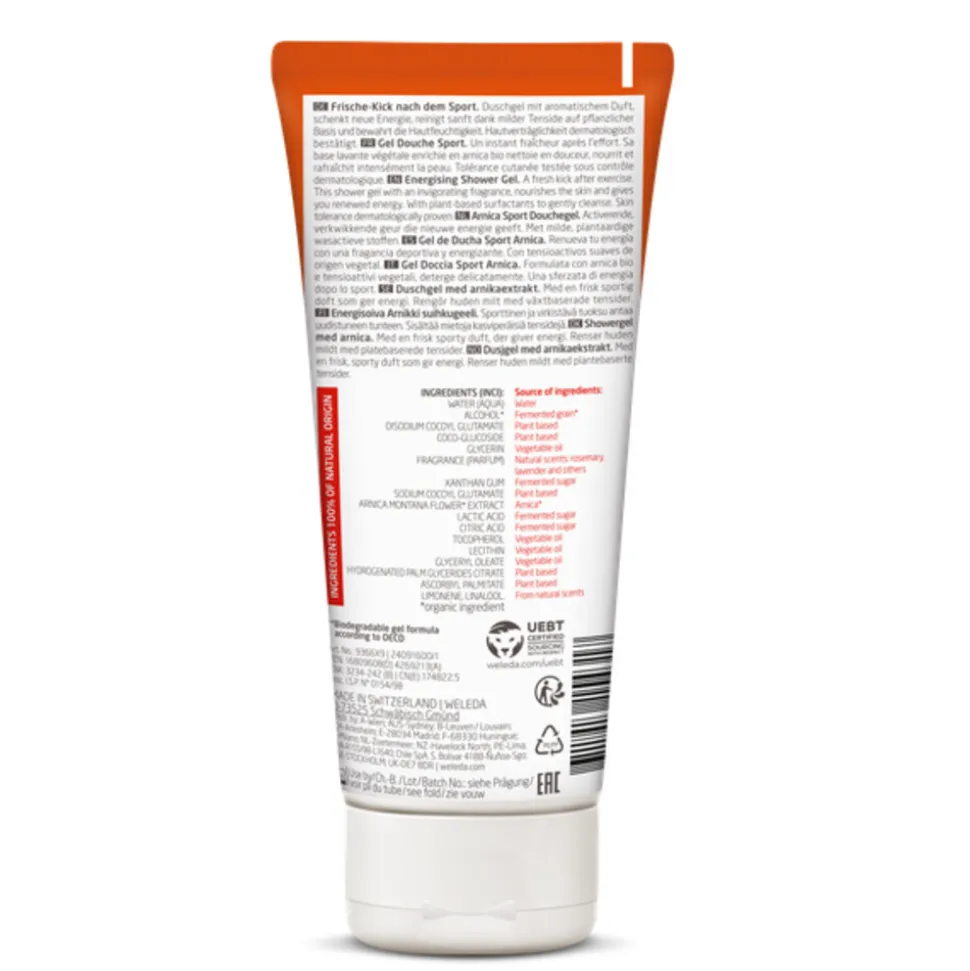 Laad jezelf weer op na het sporten en ervaar nieuwe energie. Deze milde douchegel op basis van 100% plantaardige stoffen reinigt je huid zacht. Tip: gebruik na het douchen Arnica Sport Massageolie om zo de spieren soepel en warm te houden.
