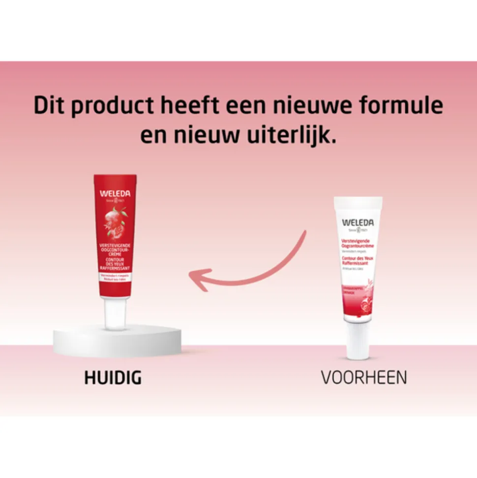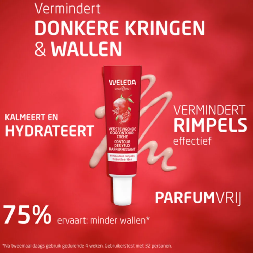 Rond de ogen kunnen gemakkelijk tekenen van huidveroudering ontstaan. Weleda Verstevigende Oogcontourcrème is een parfumvrije crème, boordevol antioxidanten en peptiden, die zorgt voor een zichtbaar stevigere huid rond de ogen. Kalmerende, parfumvrije crème met biologische granaatappel en maca-peptiden, die de gevoelige huid rond de ogen verkwikt en verstevigt. Vermindert rimpels, donkere kringen en wallen.