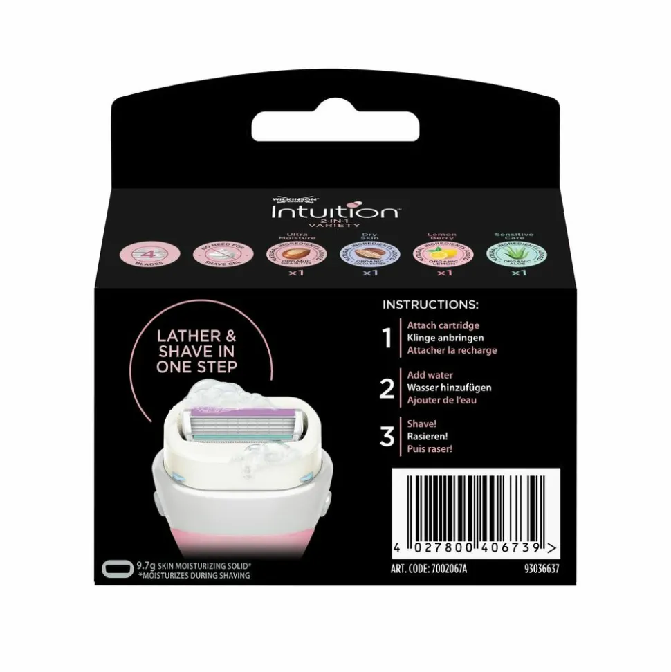 De Wilkinson Intuition Variaty zijn perfect voor actieve vrouwen. De 4 scherpe mesjes met een beschermende strook zijn omgeven door een huidconditioner, die in één stap schuimt, scheert en vocht geeft door alleen maar water toe te voegen. Scheergel is hierdoor verledentijd.