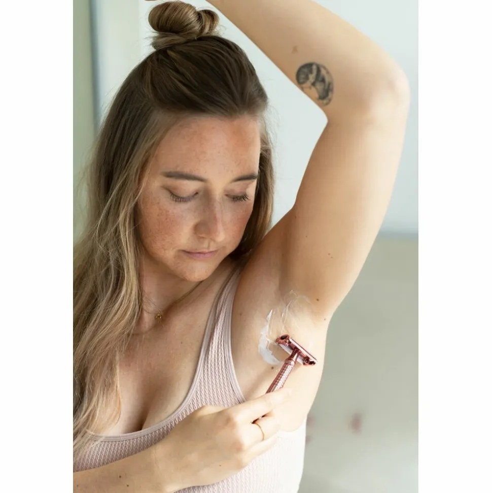 Stap 4: Laat de Safety Razor langzaam en gelijkmatig over je huid glijden. Oefen geen extra druk uit – het gewicht van het scheermes is voldoende. Trek met je vrije hand huidplooien strak (bijvoorbeeld onder je oksels)