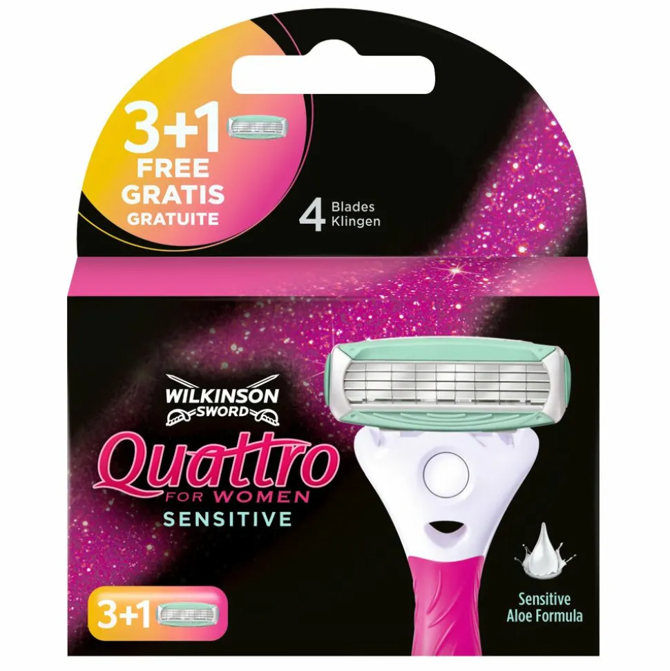 De Wilkinnson Quattro Sensitive for Women biedt vier ultradunne mesjes en een geïntegreerde conditioningstrip met Aloë Vera en Vitamine E. Voor een langdurig fluweelzachte huid – ideaal voor alledaagse avonturen!