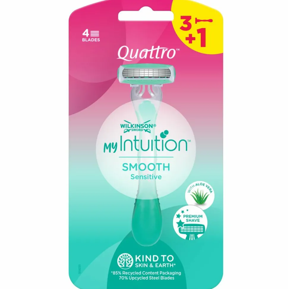 Wilkinson Sword Quattro my Intuition Smooth Sensitive is het vrouwen wegwerpmesje met 4 ultradunne mesjes. Voor een fluweelzacht en glad resultaat voor de oksels, benen en de bikinilijn. Ook geschikt voor de moeilijk bereikbare plekken op het lichaam vanwege de bewegende kop. Het beschermingsmechanisme biedt extra bescherming tegen huidirritatie en snijwondjes. Deze verpakking bevat 4 (3+1 gratis) wegwerpmesjes. Bij Wilkinson Intuition begrijpen we dat een ieders leven anders is, daarom maken wij ontharingsproducten die passen bij iedere levensstijl en schoonheidsbehoeftes. Welk lichaamsdeel je ook wilt ontharen of stylen, Intuition by Wilkinson heeft dat product voor jou.