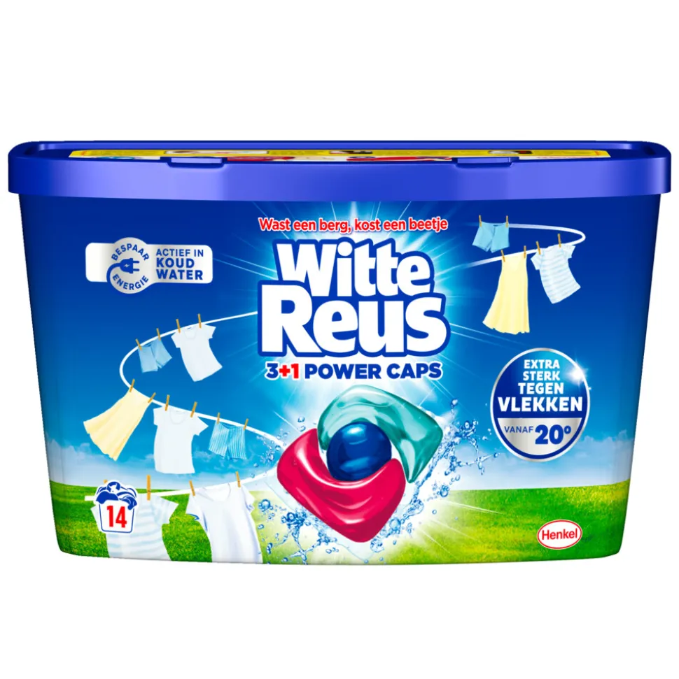 - Witte Reus Power Caps combineert alle voordelen van een wasmiddelcapsule en biedt de vertrouwde Reuzenwaskracht, zelfs bij lage temperaturen, in een handige voorgedoseerde vorm.