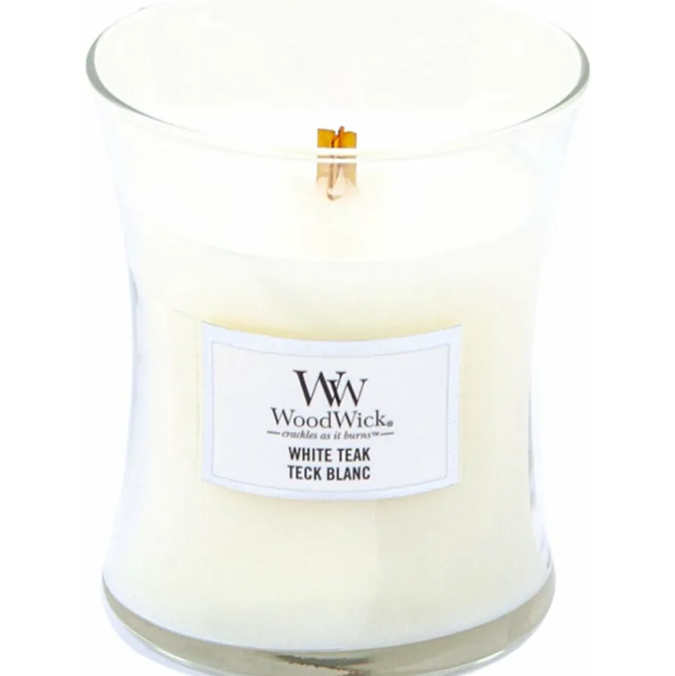 WoodWick White Teak Medium Candle is een mooie aanvulling in jouw interieur! De geurkaarsen van WoodWick hebben een uniek knisperend houten lont. De geuren zijn met zorg samengesteld en uitgebreid getest, en zorgen voor een heerlijke geur én sfeer in jouw huis. WoodWick White Teak is een houtige geur. Ontdek de aroma’s van balsemtakken gemixt met sandelhout en eikenhout. De top- en middennoten bestaan uit lavendel, sandelhout, balsem en eikenhout. De basisnoten bestaan uit teakhout en mos De basisnoten bestaan uit teakhout en mos.