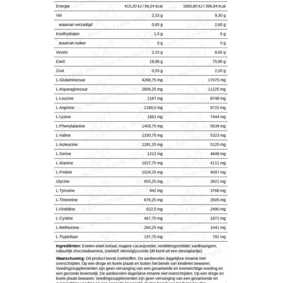 Erwten-eiwit isolaat, magere cacaopoeder, verdikkingsmiddel: xanthaangom, natuurlijk chocoladearoma, zoetstof: steviolglycoside (dit komt uit een steviaplantje).