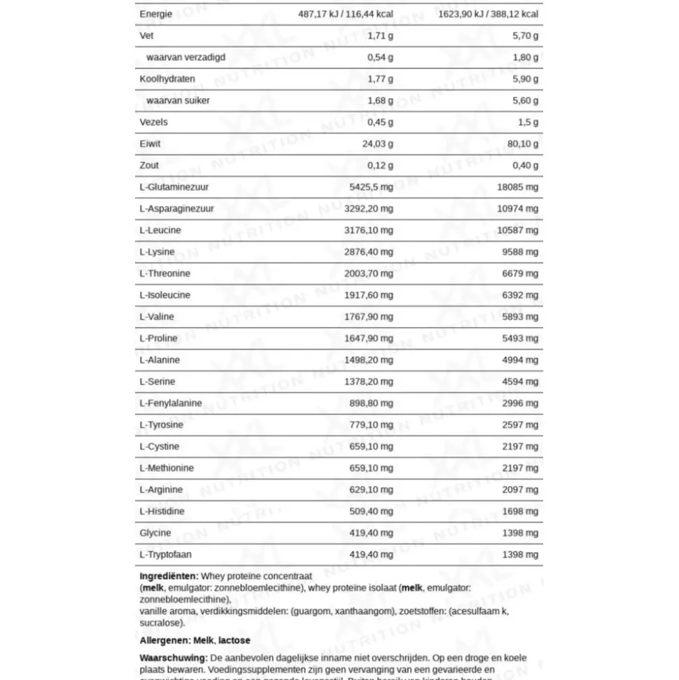 Whey proteine concentraat (melk, emulgator: zonnebloemlecithine), whey proteïne isolaat (melk, emulgator: zonnebloemlecithine), bananen aroma, zout, verdikkingsmiddelen: (guargom, xanthaangom), zoetstoffen: (acesulfaam k, sucralose). kleurstof: beta-caroteen.