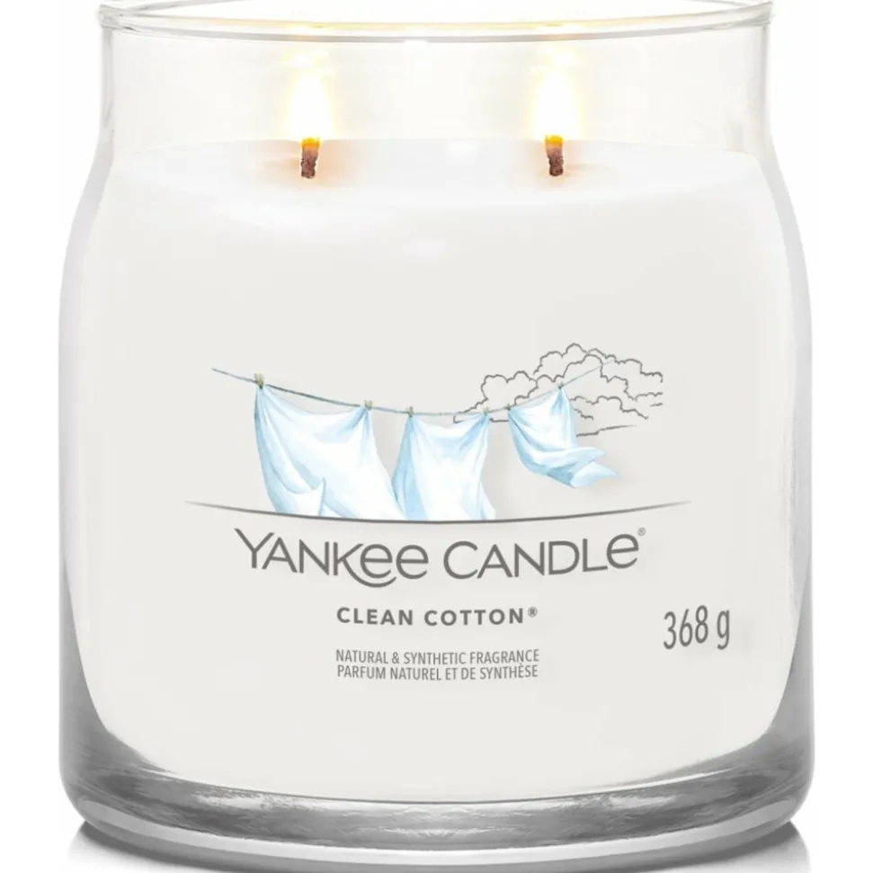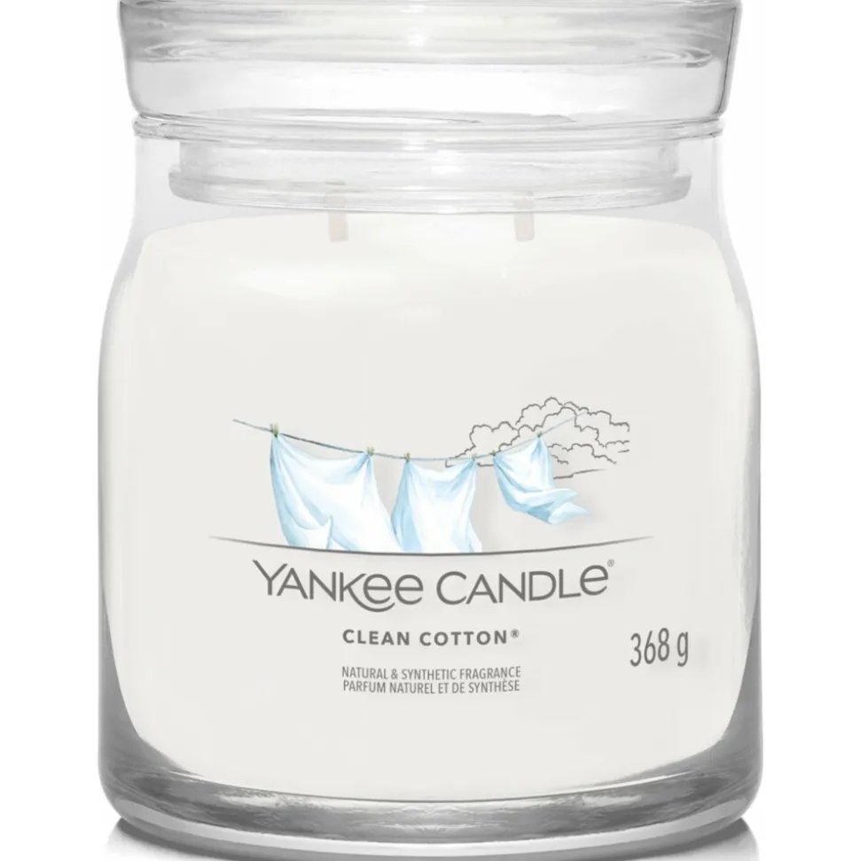 Met tot wel 50 uur brandplezier is de Signature Medium Jar van Yankee Candle ideaal voor lang gebruik en de absolute bestseller! Yankee Candle Clean Cotton, de geur van frisgewassen katoenen lakens die je buiten in de zon hebt laten drogen, dit gecombineerd met de geur van witte bloemen, groene blaadjes en een vleugje citroen. De topnoten zijn ozon, groene bladeren en bergamot. Lelietjes-van-dalen en roos vindt je in de middennoten. De basisnoten zijn vetiver, cederhout en muskus.