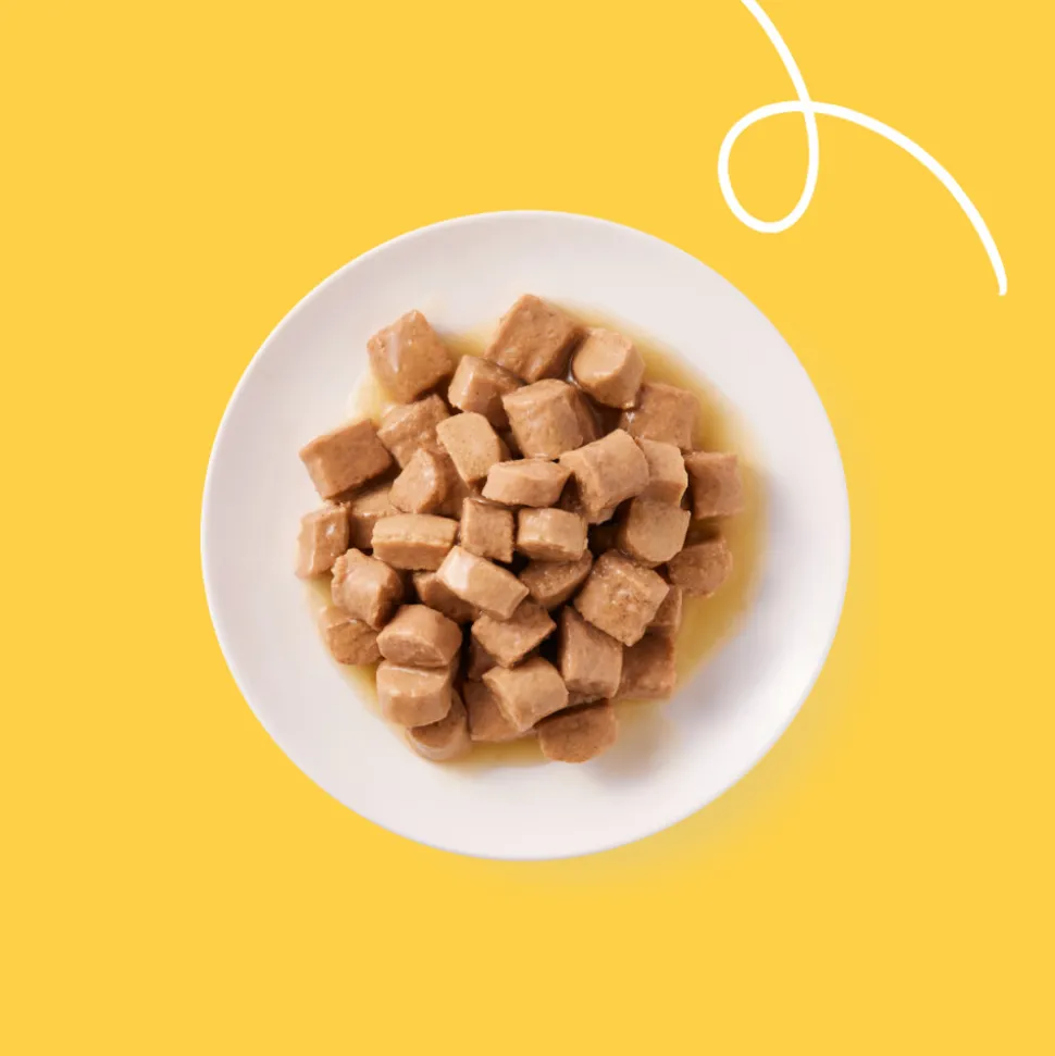 Geen hond is hetzelfde. Daarom vind je de op de verpakking de aanbevolen dagelijkse hoeveelheid biologische chunks met kip en rund, gebaseerd op het gewicht van je hond.