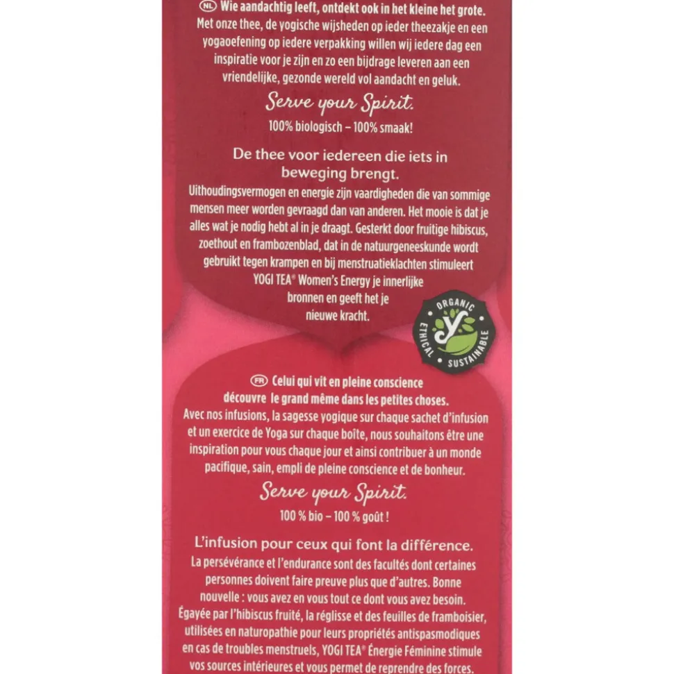 Vrouwen kunnen de hele wereld in zich dragen. Bestaat er iets krachtigers? De kracht van vrouwen is subtiel en verbonden met natuurlijke schoonheid en intuïtie. Deze Yogi Tea Women’s Energy is een enthousiaste en heerlijke levendige thee dankzij de fruitige hibiscus, frambozenblad en extract van engelenwortel.