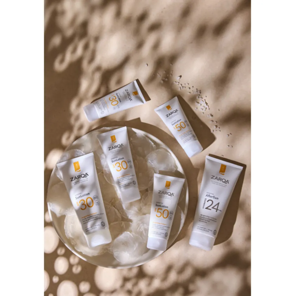 ZARQA AfterSun is een verzachtende en verzorgende lotion voor zelfs de meest gevoelige huid. De kalmerende lotion beschermt de huidbarrière tegen uitdroging en is verrijkt met aloe vera en een hydratatieboostercomplex voor langdurige hydratatie. De parfumvrije formule plakt niet, is niet vet en trekt snel in. De AfterSun heeft een verkoelende werking en kan helpen bij het kalmeren van een geïrriteerde rode of zongevoelige huid. Na gebruik voelt de huid gehydrateerd, soepel en zacht aan. Voor het hele gezin.