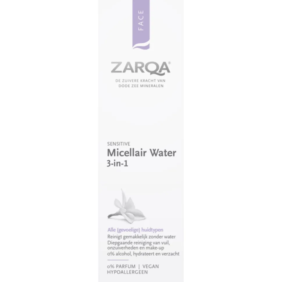 Zarqa Micellair Water – met Dode Zee mineralen en aloë vera – heeft een 3-in-1 werking: het reinigt de huid, verwijdert make-up en onzuiverheden en helpt met het herstellen en kalmeren van de huid. Micellen zijn microscopisch kleine deeltjes die als een magneet vuil, make-up en overtollig talg omsluiten; het gebruik van water, hard wrijven en afspoelen is hierdoor niet nodig. Aloë Vera en provitamine B5 kalmeren de huid en helpen de vochtbalans van de huid herstellen. Zarqa Micellair water bevat geen parfum, geen alcohol en geen andere irriterende stoffen als zeep en is zo mild dat het zelfs kan worden gebruikt op de gevoelige huid rondom de lippen en ogen. De huid voelt na gebruik gehydrateerd, schoon en niet trekkerig aan.