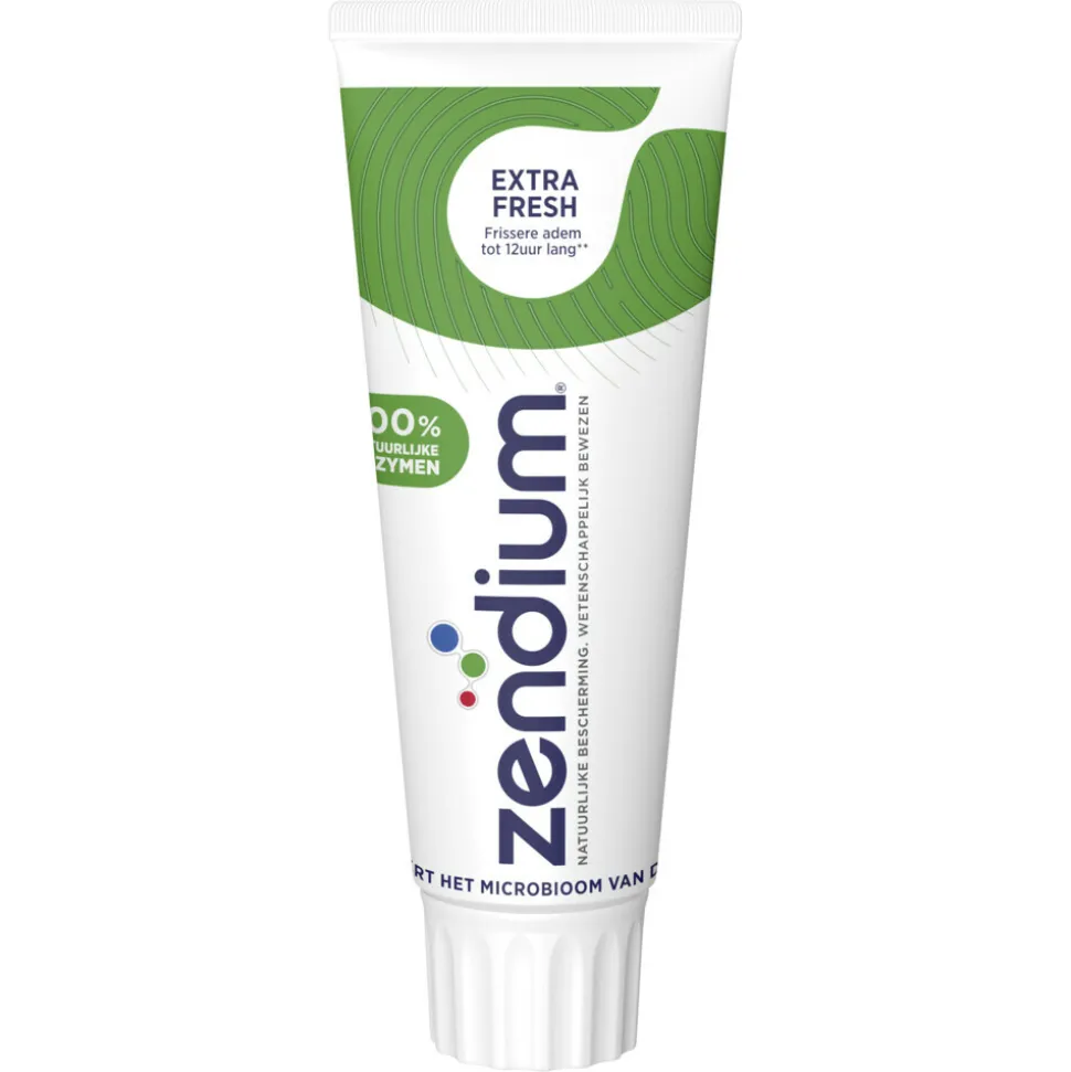 Zendium Extra Fresh Tandpasta Zendium geeft een frissere adem tot 12 uur lang**. Zendium tandpasta versterkt de natuurlijke afweer van de mond. Wist je dat er meer dan 100 miljard bacteriën in je mond aanwezig zijn? De unieke formulering van Zendium tandpasta, met 100% natuurlijke enzymen, stimuleert de goede bacteriën in je mond terwijl het de slechte bacteriën tegengaat om zo je mond in gezonde conditie te houden. Zendium, natuurlijke bescherming*, wetenschappelijk bewezen.