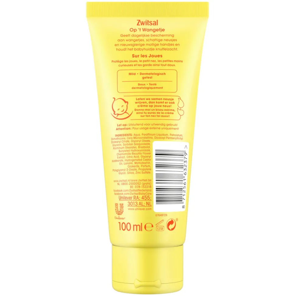 Zwitsal Op ’t Wangetje is een crème die het gezicht van jouw kleintje de beste bescherming biedt bij weer en wind. Een zachte en milde crème, verrijkt met kamille-extracten die ervoor zorgen dat schrale wangetjes verleden tijd zijn. Ook bij zonnige dagen biedt Zwitsal Op ’t Wangetje goede verzorging voor het huidje. De handige tube waar de crème in zit, maakt het mogelijk om het product overal mee naar toe te nemen. Altijd handig voor onderweg en mee te nemen in je luiertas. Heeft jouw kleintje vaker last van droge plekjes? Na het aanbrengen van deze crème wordt het huidje binnen korte tijd weer knuffelzacht. Het is een fijne, milde crème en daarmee geschikt voor ieder type babyhuidje.