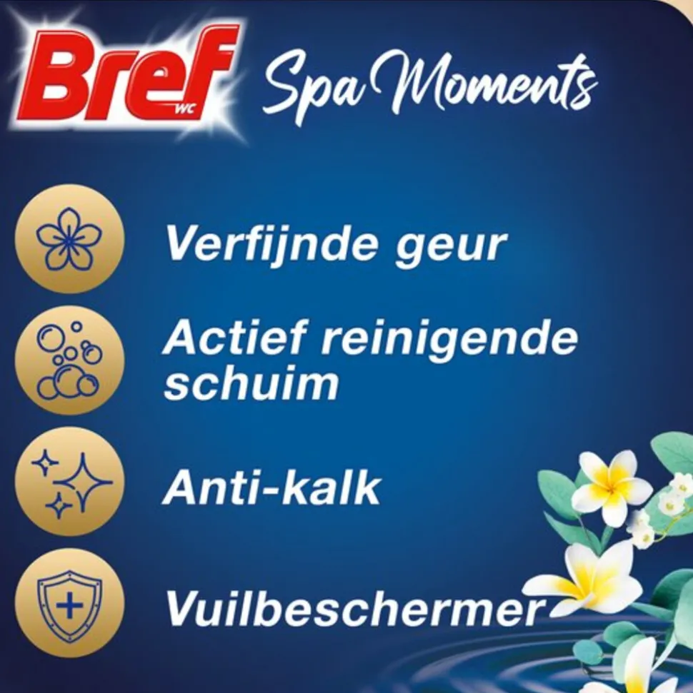 Bref Toiletblok Wellness Scents Calmness zorgt voor een schoon en fris toilet door middel van de 4 Functies Formule: