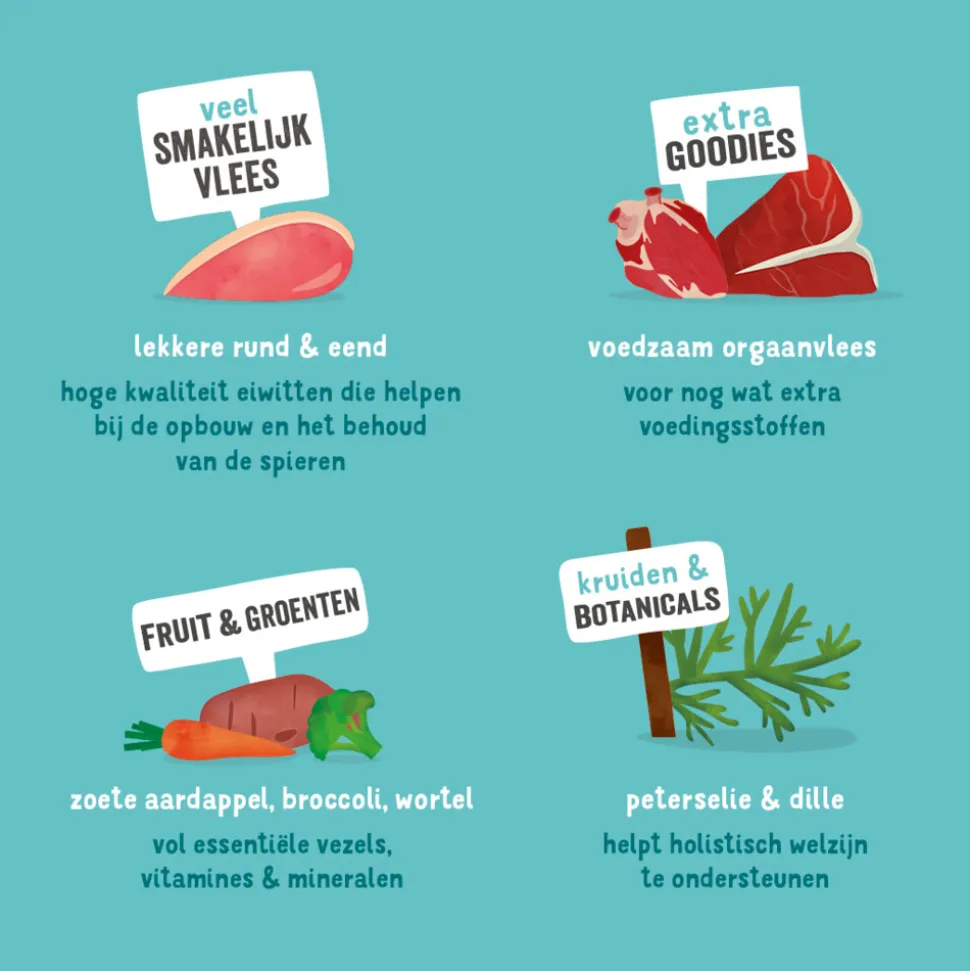 Lekkere vleesmaaltijd gemaakt van 100% natuurlijke ingrediënten. Vlees is een van de belangrijkste ingrediënten voor de voeding van je hond. Vers vlees zit namelijk boordevol proteïnes of eiwitten. En die zijn superbelangrijk voor een gezond leven. Rund en eend bevatten proteïnes van hoge kwaliteit en essentiële aminozuren om de spieren te behouden. Daarnaast bevat het voer zoete aardappel, broccoli en wortel. Deze zitten vol met belangrijke vitamines, mineralen en vezels. Zoete aardappel zorgt voor een lage glycemische index. Edgard & Cooper Vers vlees is geschikt voor alle honden, groot of klein, dik of dun, jong en oud.