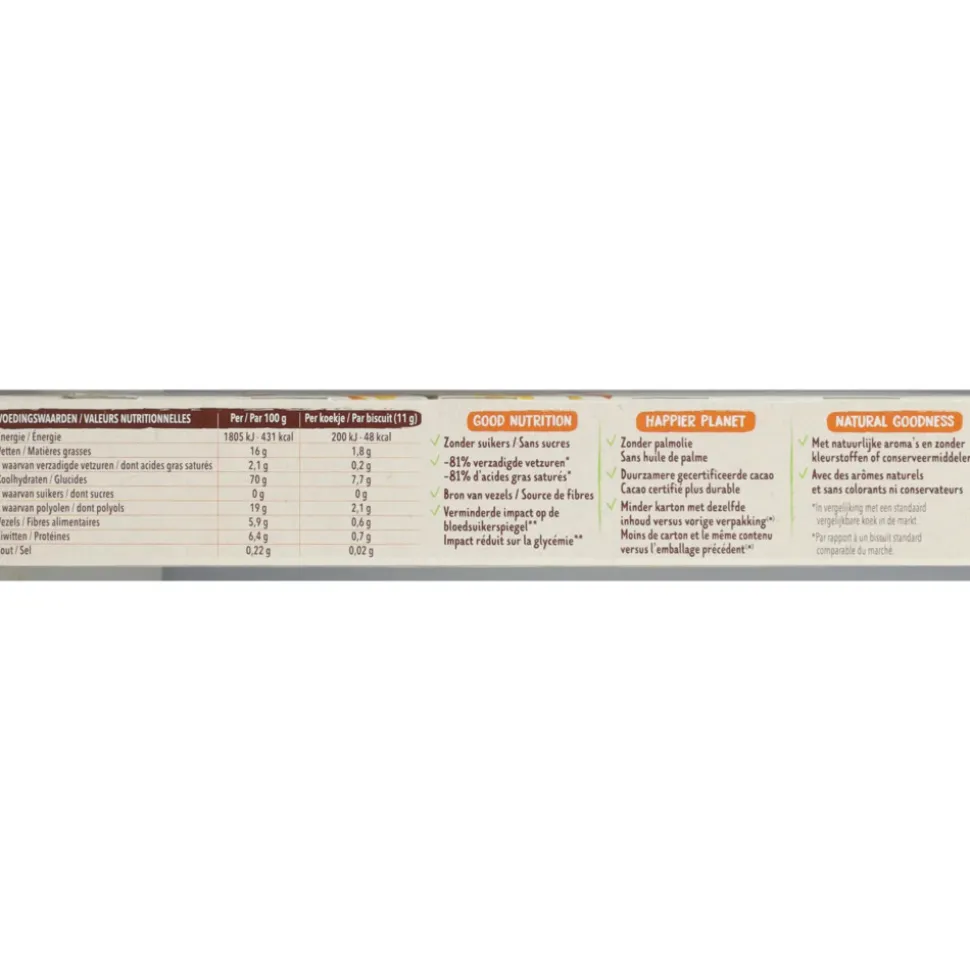 Ingrediënten TARWEbloem, zoetstof: maltitolen, koolzaadolie, TARWEzetmeel, chocoladestukjes met maltitol 5,3% (zoetstof: maltitolen, cacaomassa*, emulgator: SOJAlecithinen, ontvet cacaopoeder*, natuurlijk vanillearoma), TARWEdextrine, natuurlijk cacao aroma, zeezout, emulgator: koolzaadlecithinen, natuurlijk sinaasappelaroma, rijsmiddel: ammoniumcarbonaten, *Rainforest Alliance Certified™.