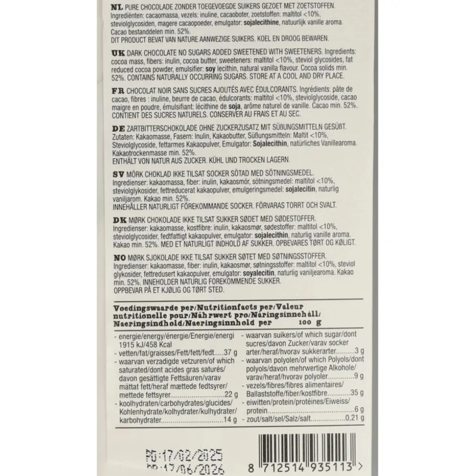 Ingredienten Cacaomassa, vezels: inuline, cacaoboter, zoetstoffen: maltitol < 10%, steviol glycosiden, magere cacaopoeder, emulgator: SOJA LECITHINE, natuurlijk vanille aroma. Cacaobestanddelen min. 52%.
