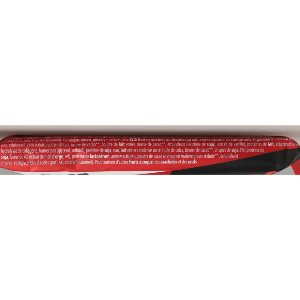 Volle MELKchocolade met zoetstoffen 28% (zoetstof (maltitol), cacaoboter**, volle MELKpoeder, cacaomassa**, emulgator (SOJAlecithine), vanille extract), MELKeiwit, zoetstof (maltitol), collageen hydrolysaat, bevochtigingsmiddelen (glycerol, sorbitol), SOJA eiwit, water, gecondenseerde volle MELK, koolzaadolie, cacaoboter**, SOJA crispies 2% (SOJA eiwit, rijstmeel, GERSTmoutextract, zout), WEI eiwit, natuurlijke aroma’s, cacaopoeder met verminderd vetgehalte**, emulgator (mono-en diglyceriden van vetzuren), zout, kleurstof (karamel).