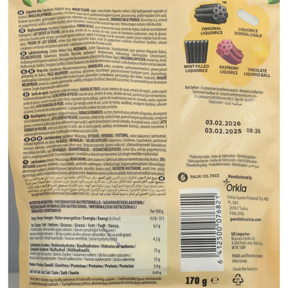 Rietsuikermelassestroop, TARWEBLOEM, suiker, cacaoboter, zoethoutwortelextract, geheel gehard plantaardig vet (kokos), VOLLE MELKPOEDER, cacaomassa, rijstzetmeel, maiszetmeel, gepasteuriseerde frambozen puree, glucosestroop, zuurteregelaar (citroenzuur), verdikkingsmiddel (arabische gom), glansmiddel (carnaubawas, plantaardige oliën (kokos, raapzaad)), MAGERE MELKPOEDER, aroma’s (o.a. anijsolie, pepermuntolie, vanilline), emulgator (lecithine), kleurstof (curcumine)