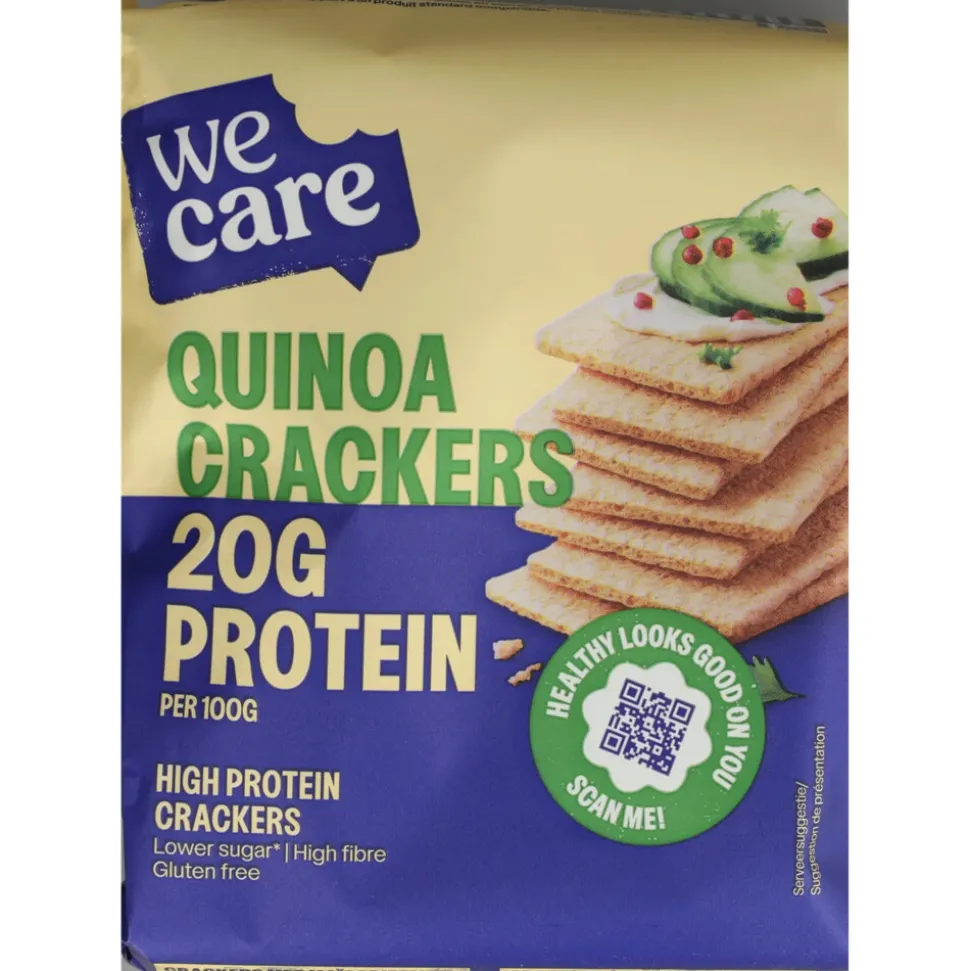 WeCare High Protein Crackers Quinoa zijn licht en luchtig van smaak, maar boordevol eiwitten, vezels en laag in calorieën. De crackers zijn zowel te combineren met hartig als met zoet beleg.