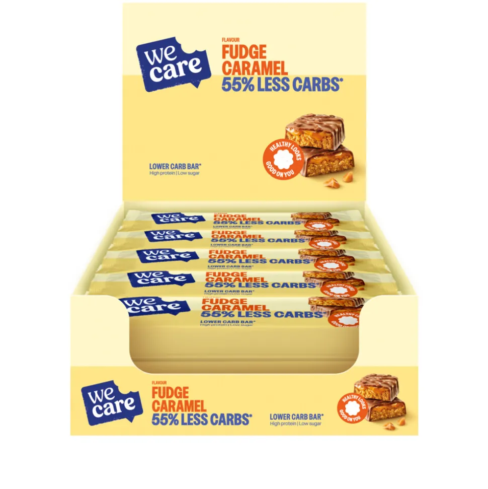 WeCare Lower Carb Bar Fudge Caramel is een heerlijke reep met karamelsmaak omhuld met een laagje melkchocolade, ideaal als tussendoortje of voor onderweg. De reep zit boordevol eiwitten, bevat 55% minder koolhydraten en is laag in suikers.