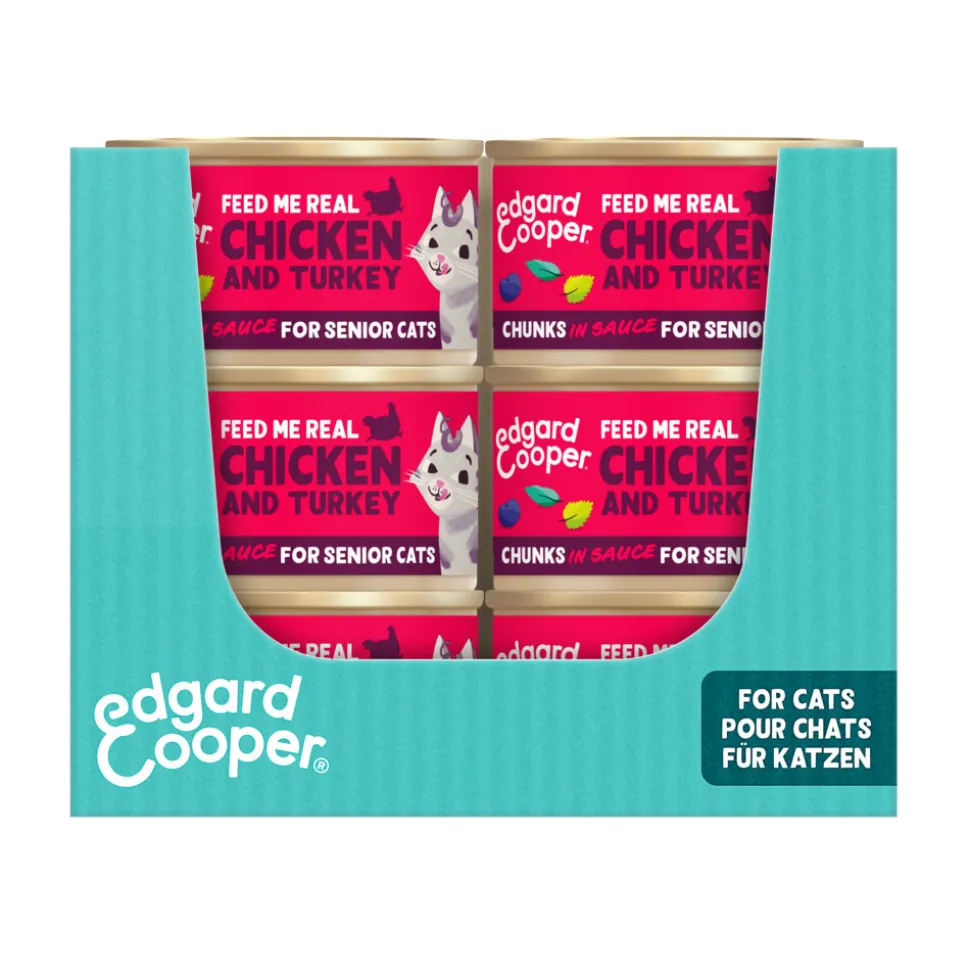 Senior katten (ervaren foodies) zijn grote fan van stukjes in saus van Edgard & Cooper. De malse stukjes vrije-uitloopkip en kalkoen zijn overgoten met een saus waar zelfs de meest kieskeurige katten pootjes en snorharen van aflikken.