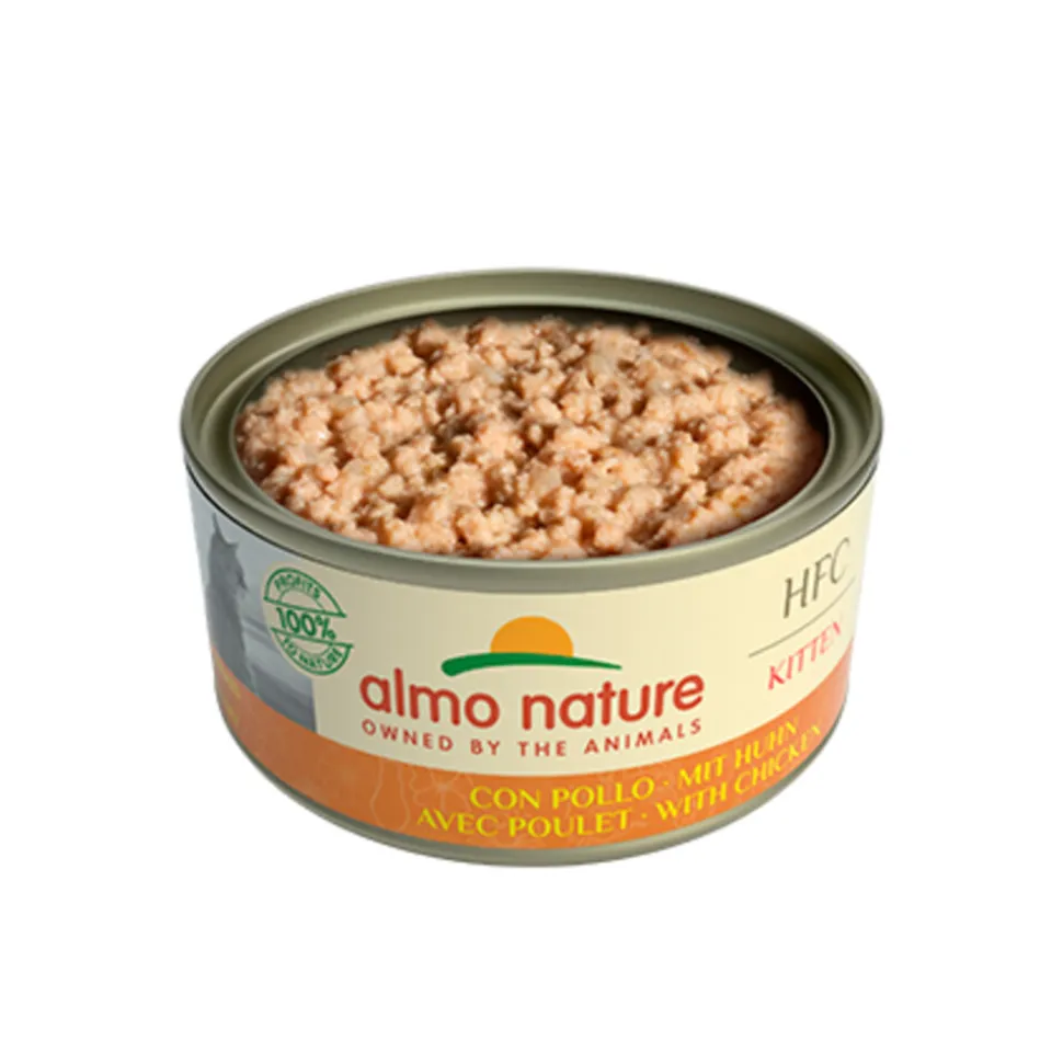 Het kittenvoer van Almo Nature bevat vers 100% HFC kippenvlees. HFC kippenvlees is vlees waarbij geen gebruik is gemaakt van antibiotica en hormonen tijdens het fokken. Het vlees dat is verwerkt in deze voeding bevat ook geen slachtafval en is oorspronkelijk goedgekeurd voor menselijke consumptie.