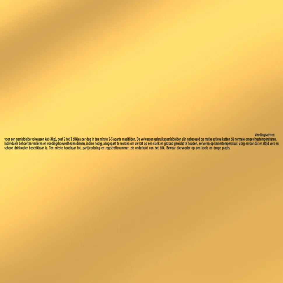 Vlees en dierlijke bijproducten, plantaardige eiwitextracten, vis en visbijproducten (waarvantonijn 4%), plantaardige bijproducten,mineralen, suiker. Analytische bestanddelen: Vocht: 74,0%; Eiwit: 17,0%; Vetgehalte: 4,0%; Ruwe as: 2,0%; Ruwe celstof: 1,1% Toevoegingsmiddelen: Nutritionele toevoegingsmiddelen: IE/kg: Vit. A: 880; Vit. D3: 135;mg/kg: IJzer(II)sulfaat-monohydraat: 31;Calciumjodaat, watervrij: 0,39; Koper(II)sulfaat-pentahydraat: 3,5;Mangaan(II)sulfaat-monohydraat: 6,1; Zinksulfaat-monohydraat: 50;Technologische toevoegingsmiddelen: mg/kg: Cassiagom 450.