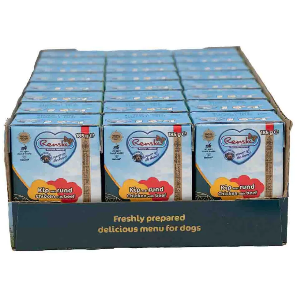 Renske Vers Kip met Rund is een 100% natuurlijke complete maaltijd met toegevoegde vitamines en mineralen. Rijk aan natuurlijke antioxidanten met een natuurlijke bron van prebiotica door de toevoeging van Xylo-oligosaccharices. Makkelijk mee te nemen op vakantie, shows en dagjes weg. Buiten de koelkast of vriezer bewaren.