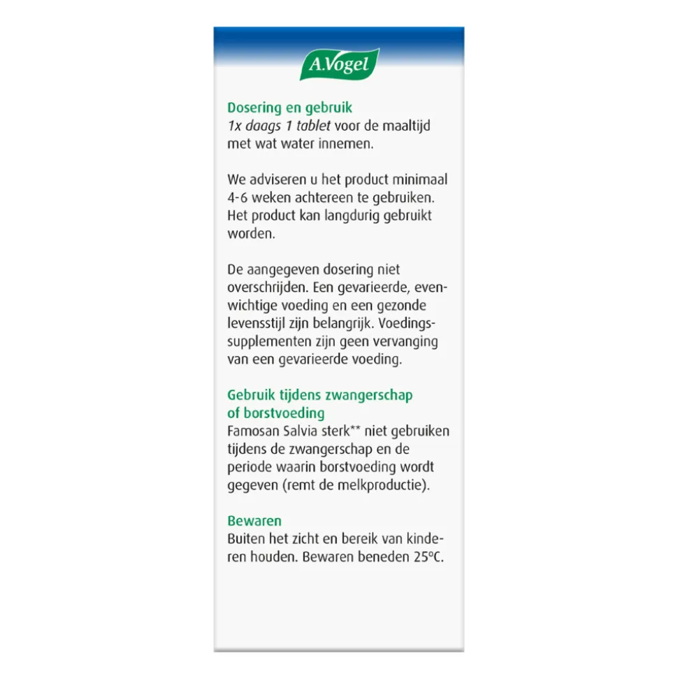- Famosan Salvia Extra Sterk niet gebruiken tijdens de zwangerschap en de periode waarin borstvoeding wordt gegeven (remt de melkproductie).