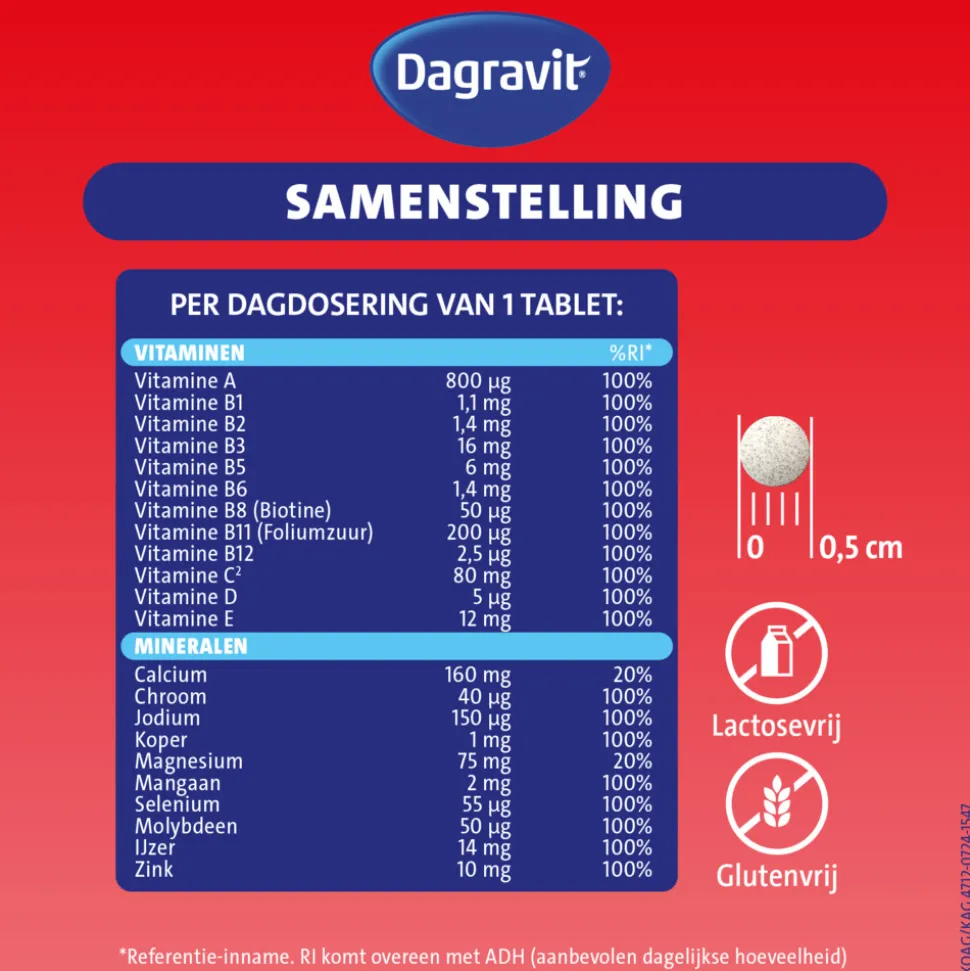 Dagravit Multi Elke Dag is speciaal ontwikkeld voor de dagelijkse aanvulling van vitaminen en mineralen. Het is een complete multivitaminen met essentiële vitaminen en mineralen in een optimale dosering (tot 100% van de dagelijkse aanbevolen hoeveelheid) in 1 tablet per dag. Vitamine A, C en het mineraal selenium ondersteunen de afweer van het lichaam. Vitamine B1, B2, B3, B5, B6 en B12 en het mineraal koper dragen bij aan een goede energiehuishouding. Deze vitaminen en mineralen zijn betrokken bij de omzetting van vetten, eiwitten en koolhydraten in ons lichaam.