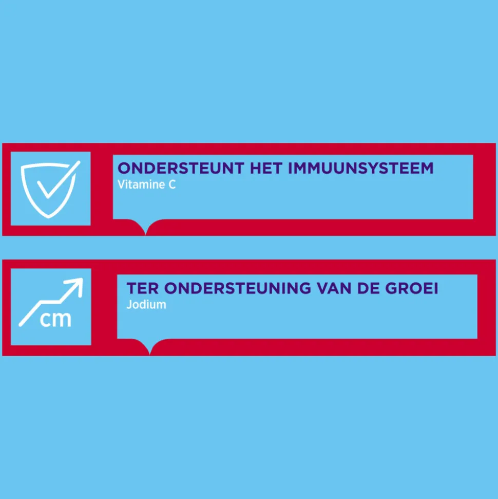 2) Vitamine D ondersteunt de groei en ontwikkeling van het beendergestel bij kinderen. Daarnaast draagt jodium bij tot normale groei van kinderen.