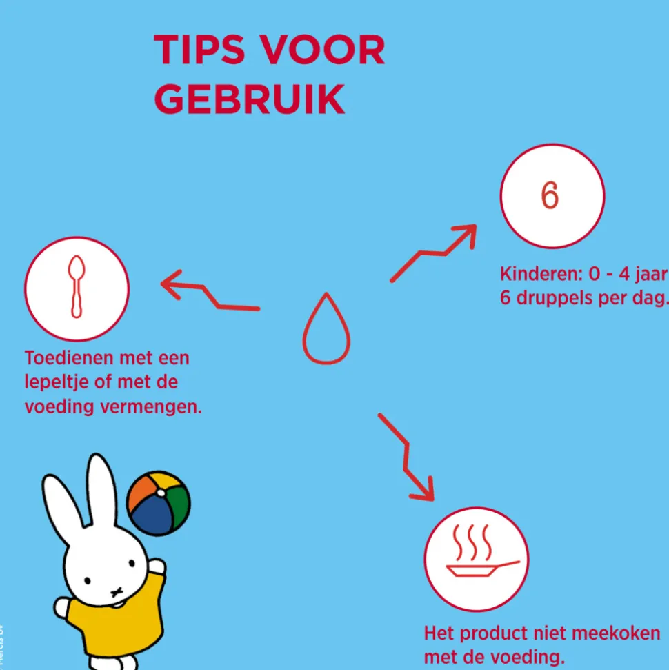 Gebruiksaanwijzing en aanbevolen gebruik per dag: 6 druppels per dag gedurende het hele jaar voor kinderen van 0 tot 4 jaar.