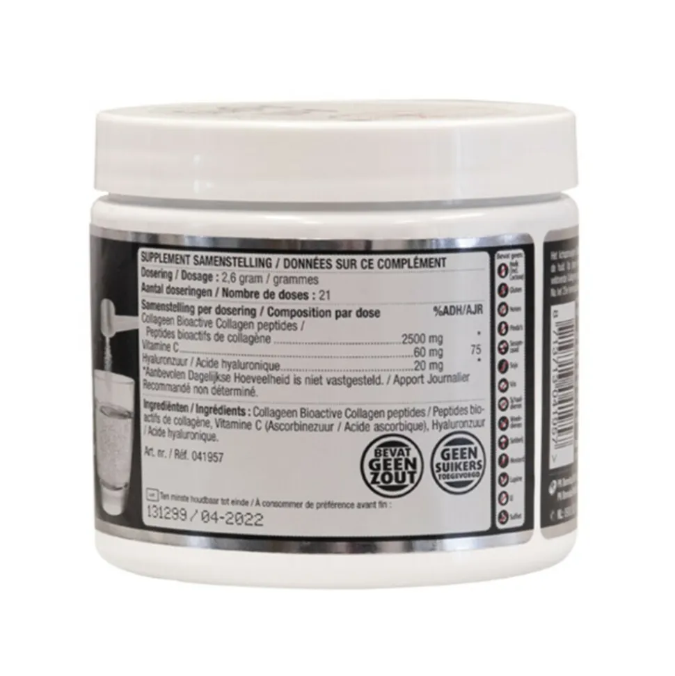 Collageen Bioactive Collagen peptides, Vitamine C (Ascorbinezuur), Hyaluronzuur.