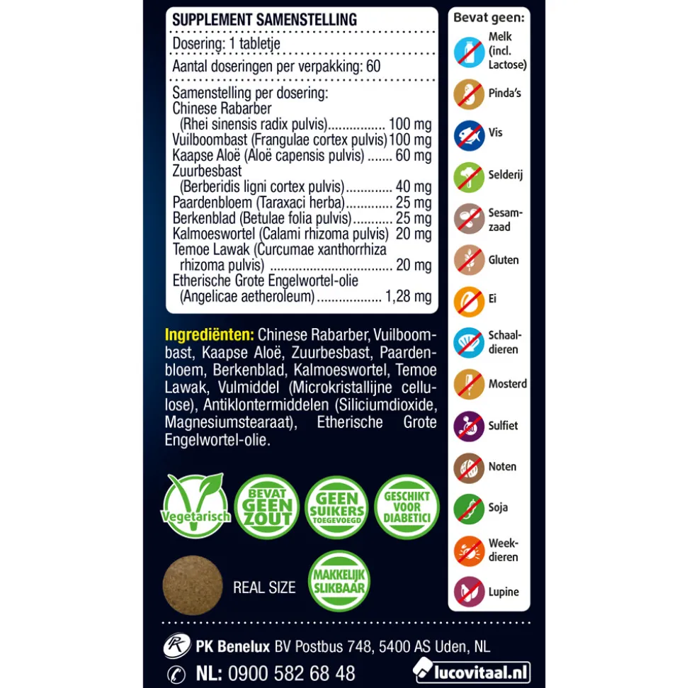 Voor het slapen gaan naar behoefte 1 tot 3 tabletjes met water innemen. Aanbevolen dagelijkse dosering niet overschrijden. Ingrediënten Chinese Rabarber, Vuilboombast, Kaapse Aloë, Zuurbesbast, Paardenbloem, Berkenblad, Kalmoeswortel, Temoe Lawak, Vulmiddel (Microkristallijne cellulose), Antiklontermiddelen (Siliciumdioxide, Magnesiumstearaat), Etherische Grote Engelwortel-olie.