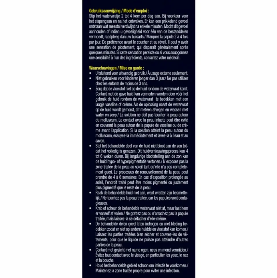 - Zorg dat de vloeistof niet op de huid rondom de waterwrat komt. Contact met de gave huid kan vermeden worden door vóór het gebruik de huid rondom de waterwrat te bedekken met een laagje vaseline of crème. Als de oplossing naast de waterwrat op de huid wordt gemorst, dit meteen afvegen en wassen met water en zeep.