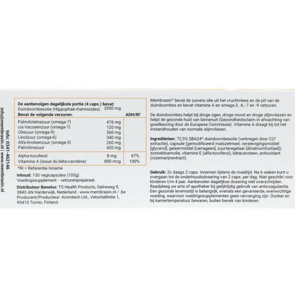Membrasin bevat de pure Duindoornbesolie uit het vruchtvlees en de pit van de duindoornbes. Als een van de weinige vruchten in het plantenrijk bevat duindoornbes van nature omega 7-vetzuren bevat. Daarnaast zit Membrasin Duindoornbesolie boordevol vitamines en omega vetzuren 3-6-9 die de huid van binnenuit voeden en het collageen in stand houden. De duindoornbes helpt bij droge ogen, droge mond en droge slijmvliezen. Vitamine A draagt bij tot de instandhouding van een normale huid en slijmvliezen en een normaal gezichtsvermogen.