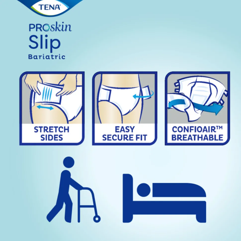 TENA Slip Super Bariatric 3XL is een open, eendelig incontinentie product met verstelbare strips voor een perfecte pasvorm, comfort en bescherming tegen doorlekken.